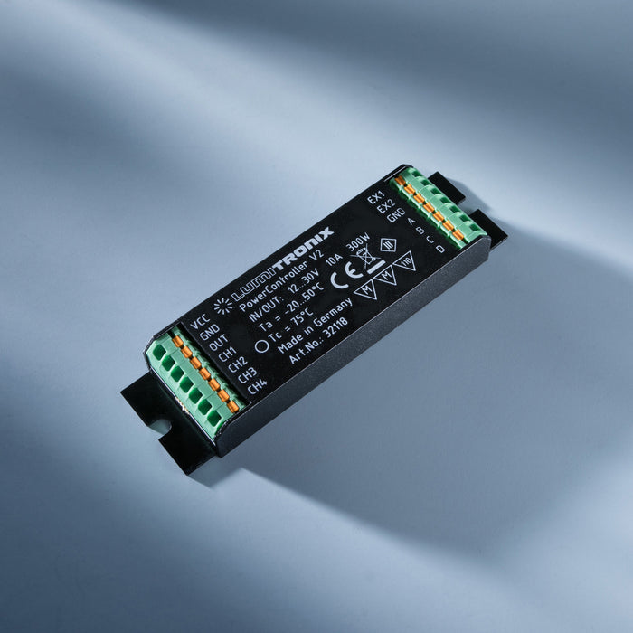 The PowerController V2 control unit from LUMITRONIX opens up a world of flexibility in lighting control. With four input channels, you can connect buttons, dimmers, potentiometers or sensors, and with the four output channels, you can implement various lighting scenarios. Whether as a one-, two-, three- or four-channel control unit, the PowerController V2 offers you the versatility you need for your lighting applications.